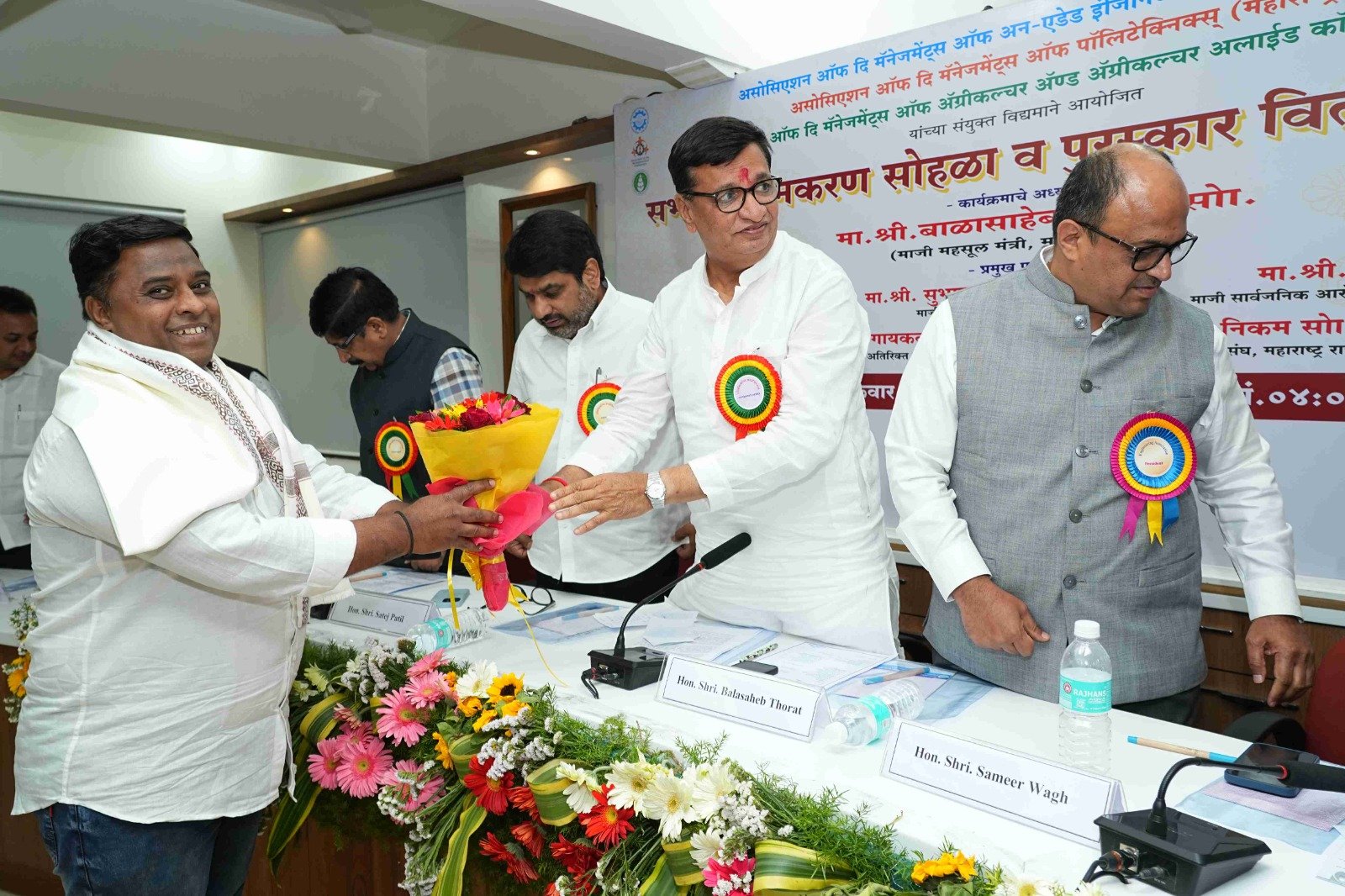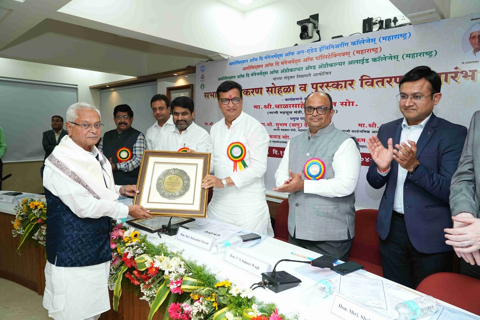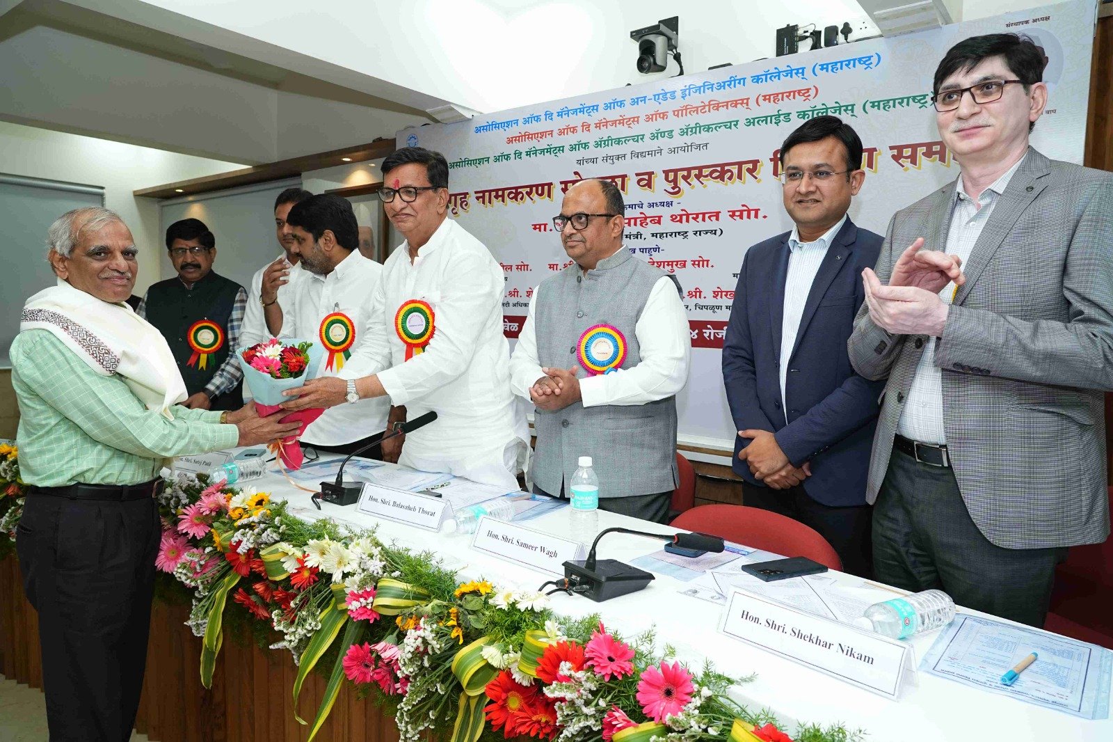 On behalf of Polytechnic Association, 'Hon. Shri. Balasaheb Wagh (Bhau) Memorial Award for Best Teacher' is awarded to Dr. Pravin Bhandari of the K K Wagh Polytechnic, Nashik. by the former Minister of State for Home Affairs of Maharashtra State Hon. Mr. Satej (Bunty) Patil in the presence of the former revenue minister of Maharashtra state Mr. Balasaheb Thorat, President of the Association Hon. Mr. Sameer Balasaheb Wagh, Treasurer Hon. Mr. Amit N. Kolhe, Hon. Dr. Anil Kumar S. Gupta and other dignitaries